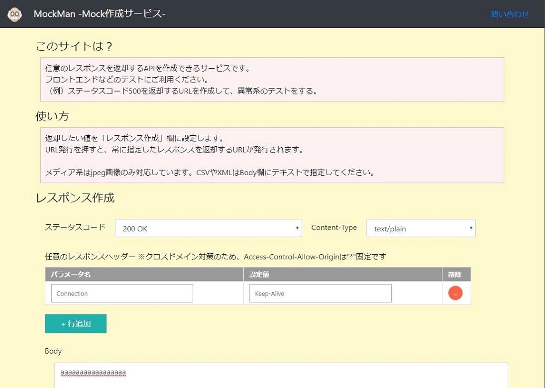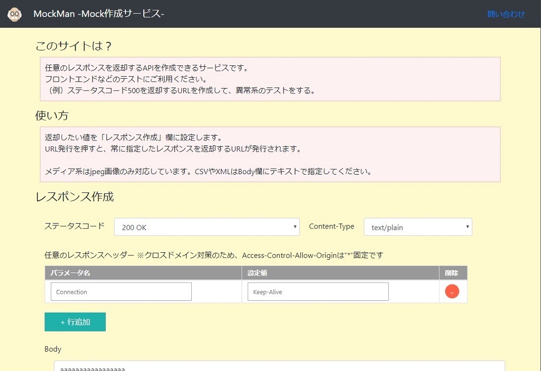 任意のレスポンスを返却するAPIを作成できるサービスです。フロントエンドのテスト用を想定しています。