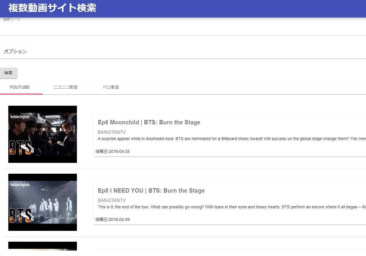 youtube、ニコニコ動画、FC2ブログを同じキーワードで一括検索できるサイトです。