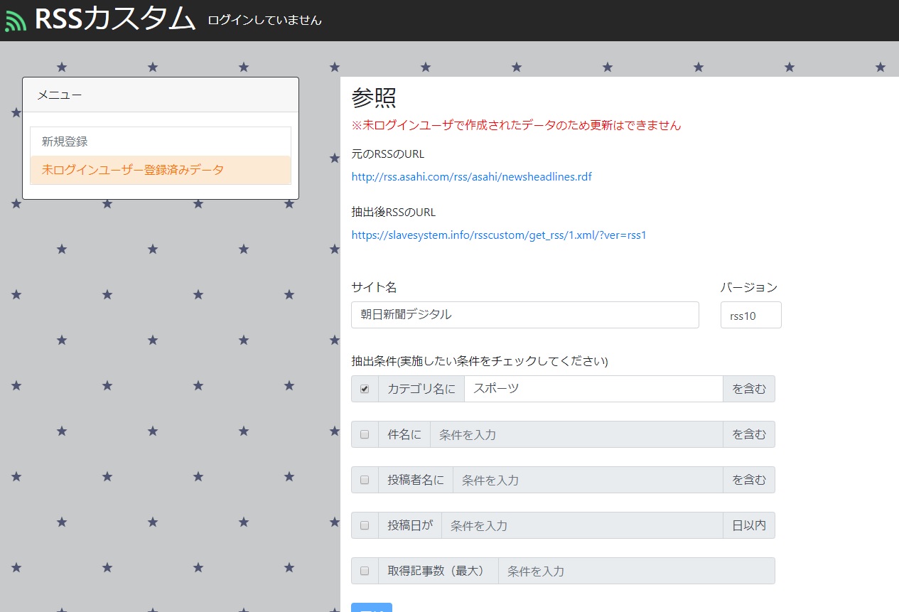 RSSの記事の中から自分が興味のある記事だけを抜き出せるサービスです。件名やカテゴリ名が一致した記事のみを取得できるURLを新規に発行します。